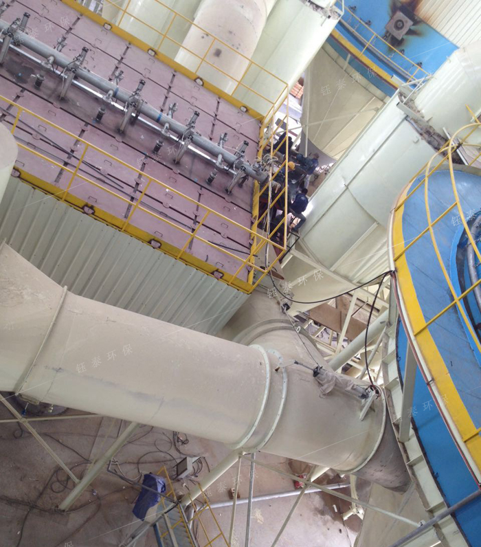噴霧干燥塔除塵器采用高溫針剌氈濾料作為過濾材料,透氣性能強,除塵效率高。采用反吹除塵法,不僅能凈化一般的含塵硫氣體,還能處理入口濃度達1300g/Nm3的含塵氣體。煙氣中所含的水蒸氣由于其溫度較高,在100℃左右,初呈氣態(tài);從噴霧塔出來后,溫度有所降低,冷凝成水滴附在煙氣中的塵粒上,呈現(xiàn)霧狀;進入氣箱脈沖袋除塵器時塵粒即被捕集下來。